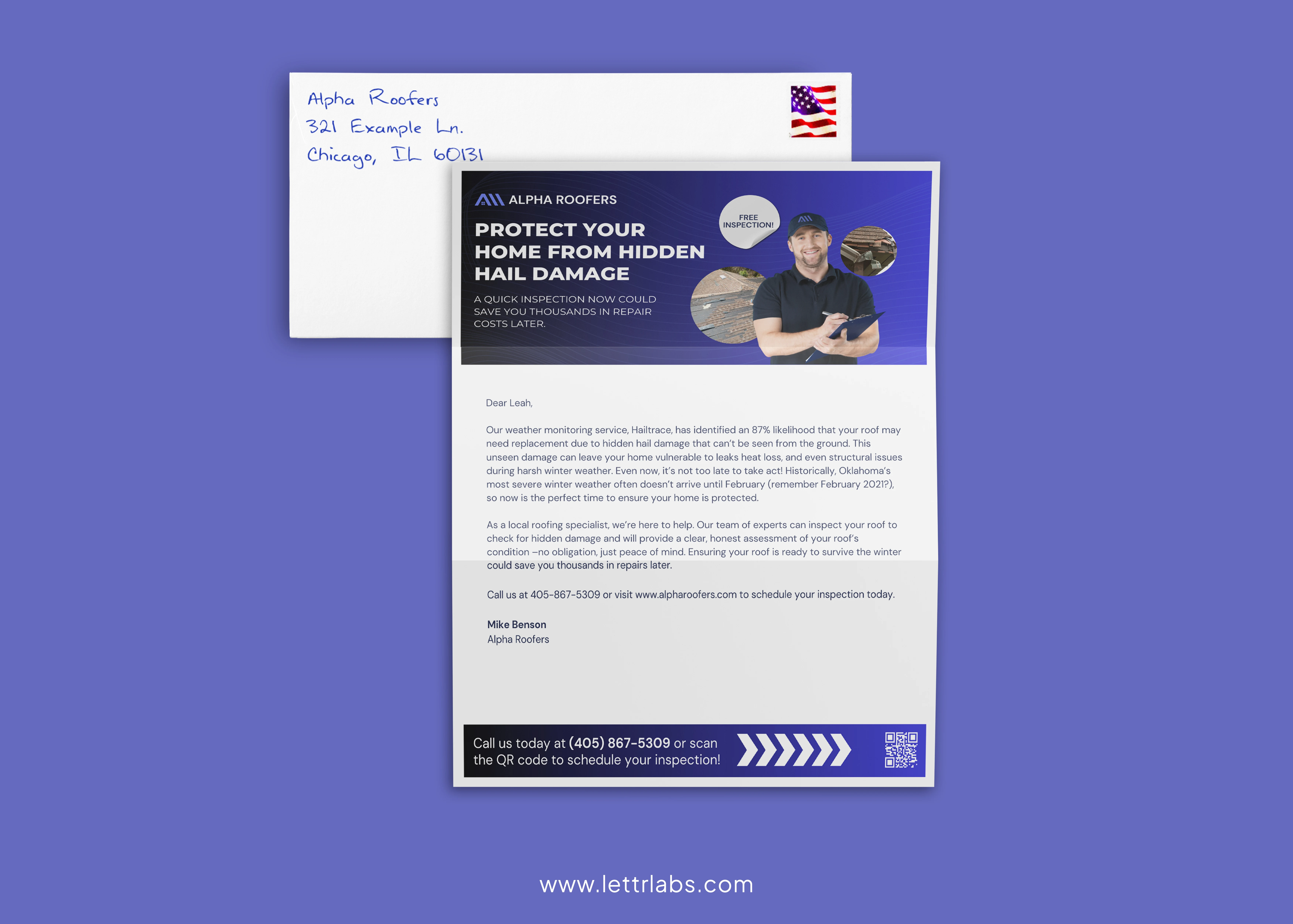 A full-size printed letter delivered in a hand-addressed #10 envelope with a real stamp. Use this format when you want a personal, high-trust mailer that still gives you room for longer copy, pricing details, or a formal proposal. The envelope is handwritten and stamped; the insert is a standard 8.5" × 11" printed sheet.